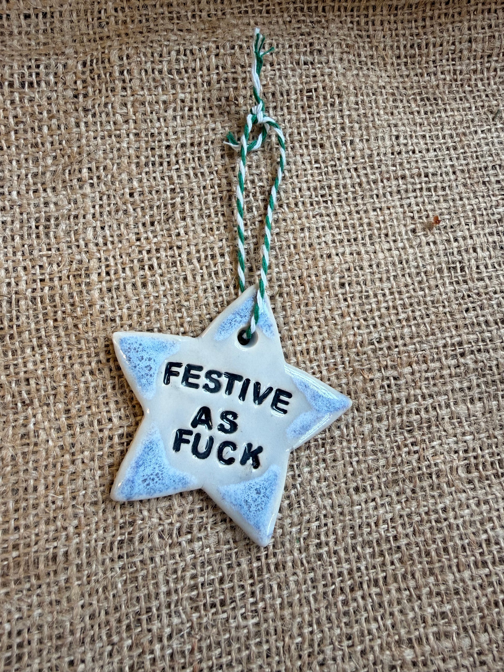 Each decoration is individually made by hand, glazed, and decorated for that proper festive feel. Finished with twisted cord, ready to hang straight on your tree (or anywhere that needs a laugh).