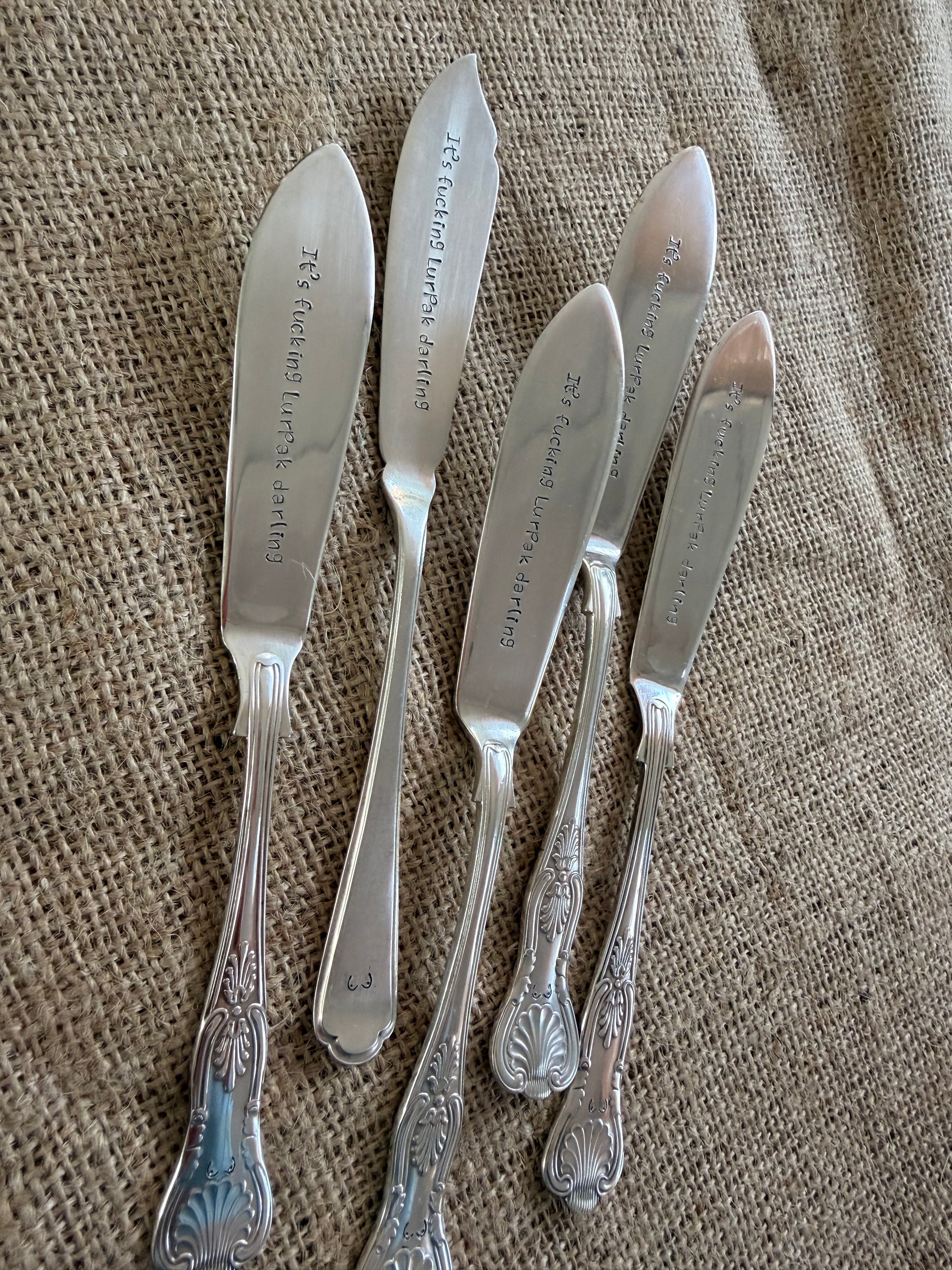 These are hand-picked, silver-plated vintage-ish butter knives that have lived a little life already — which is exactly why they’ve got so much charm. Each one is hand stamped, so no two are the same. Think perfectly imperfect, with a bit of attitude. Just like you, you little slut.