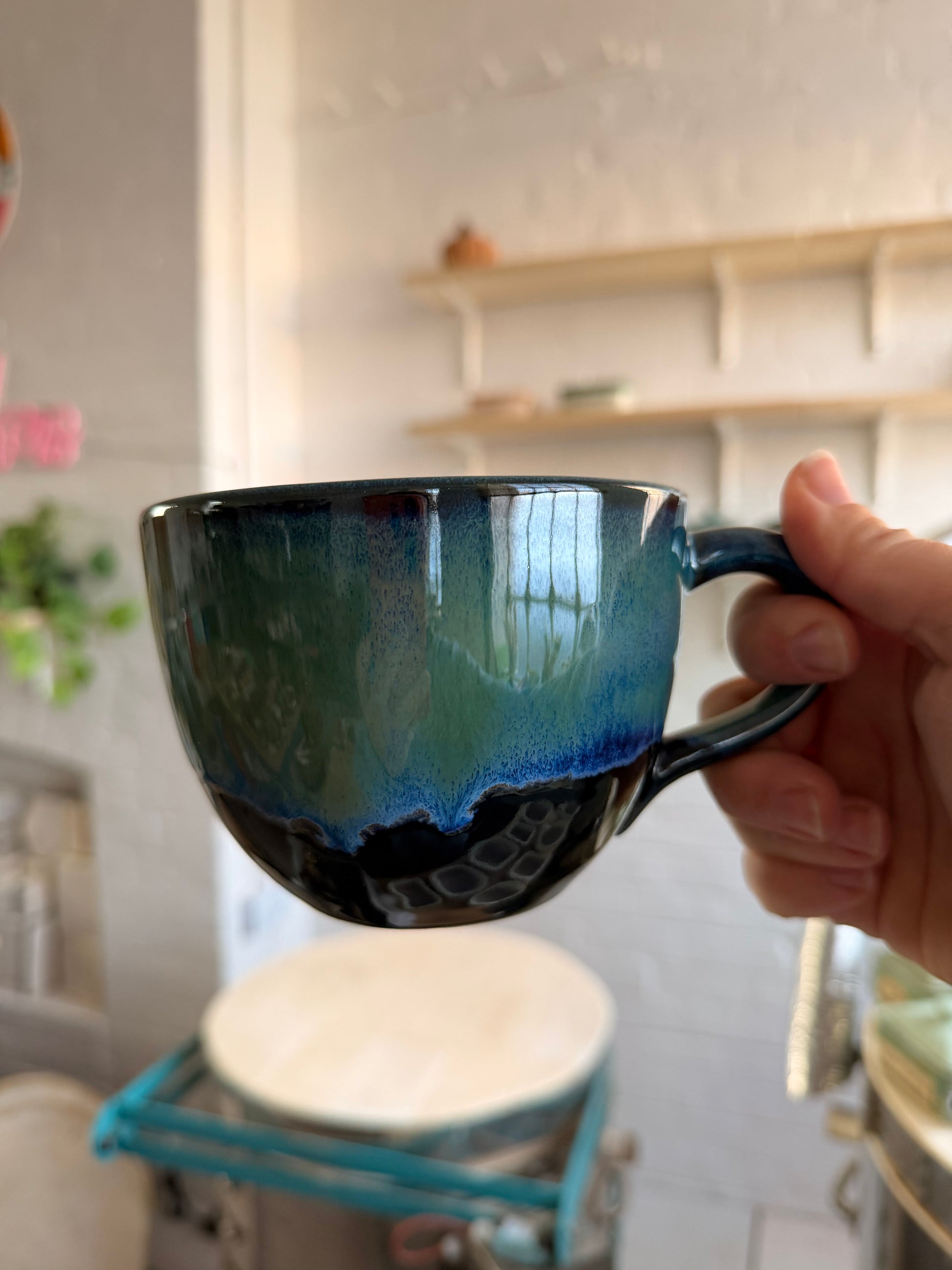 Handmade and hand glazed stoneware jumbo mug finished in black, blue and green galaxy glaze.