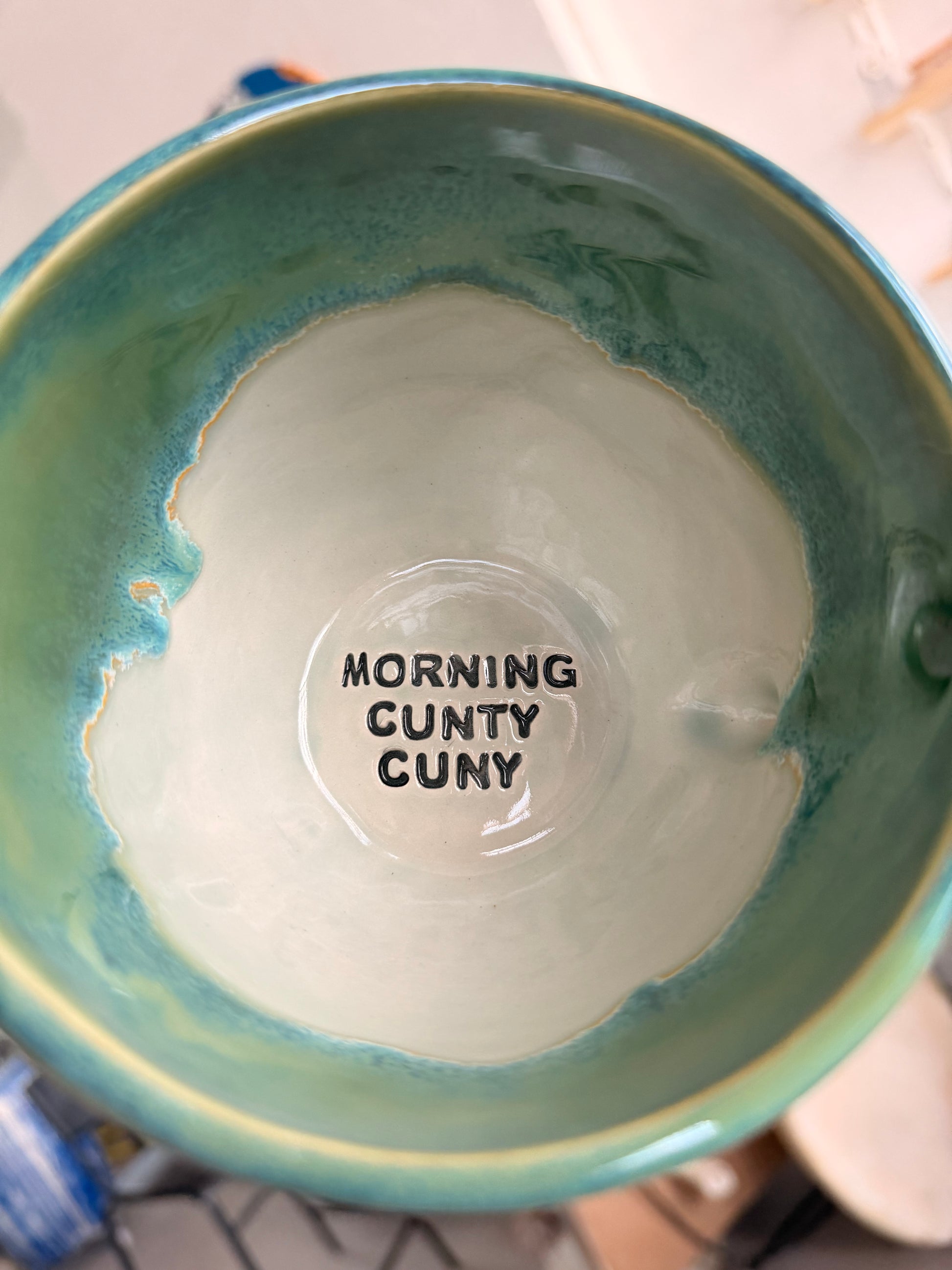 Handmade and hand glazed stoneware jumbo mug finished in a mix of green glazes. - with MORNING CUNTY CUNY inside. The mug can still be used as normal.